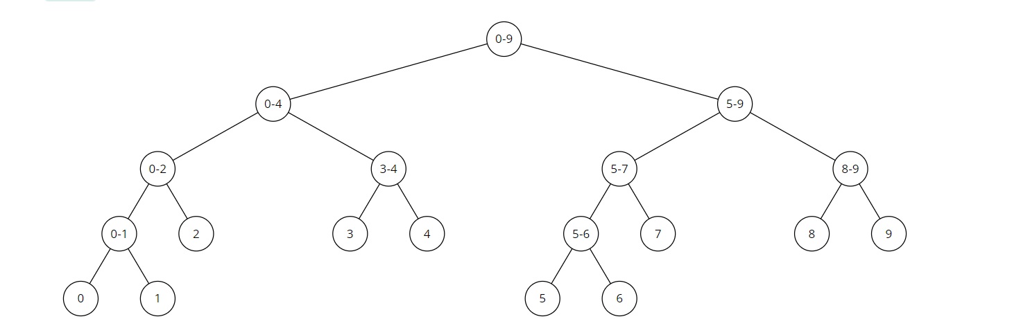 루트 노드는 [0,9]인데, [3,9]가 포함되므로 왼쪽 자식과 오른쪽 자식으로 나누어 탐색하게 된다