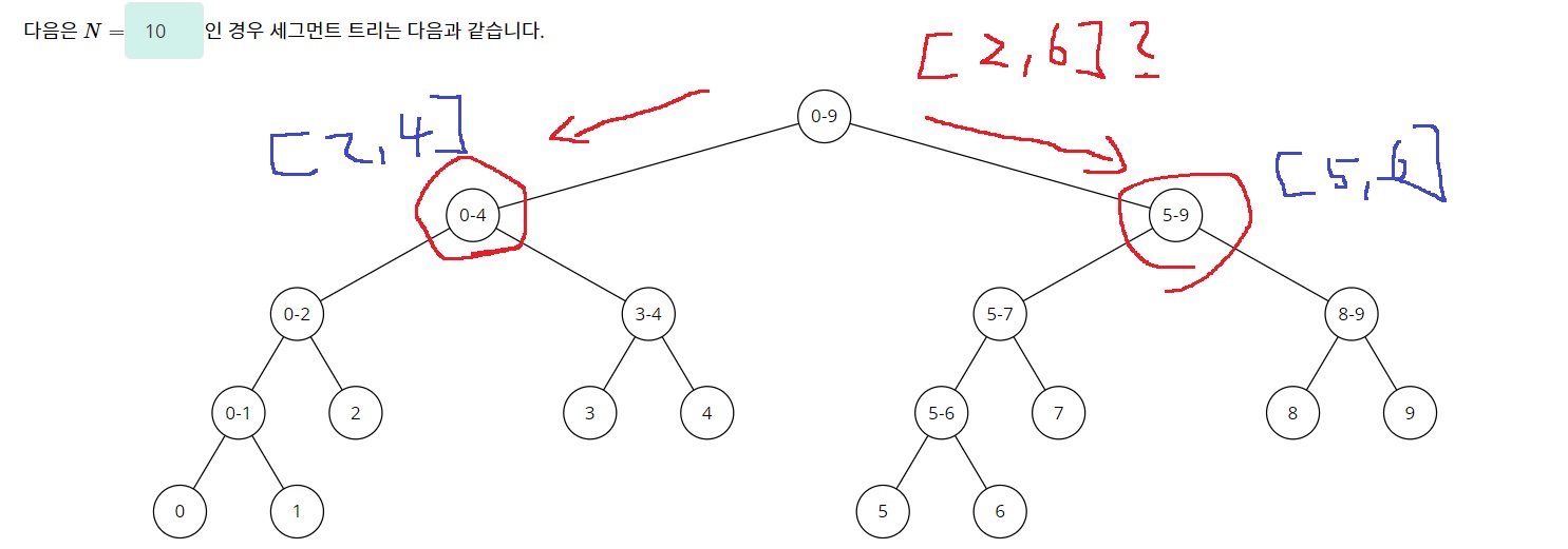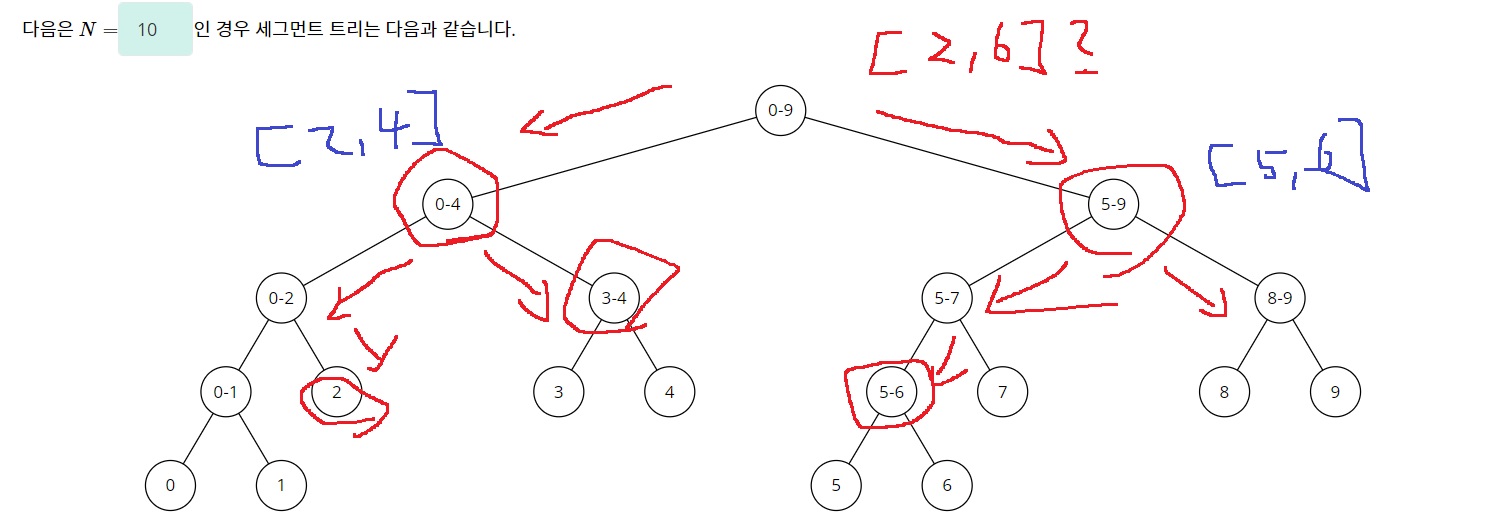 다시 [2,6]에 존재하는 구간의 합을 묻는데 처음 [0,9]는 3-3)의 경우에 해당되어 왼쪽과 오른쪽으로 나누어 탐색하는데..