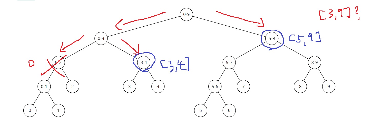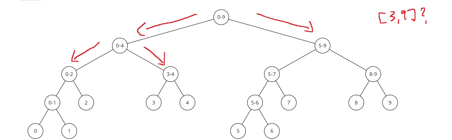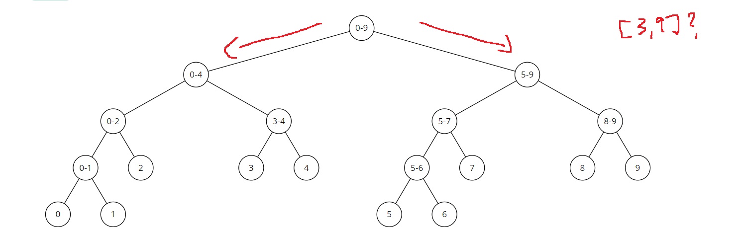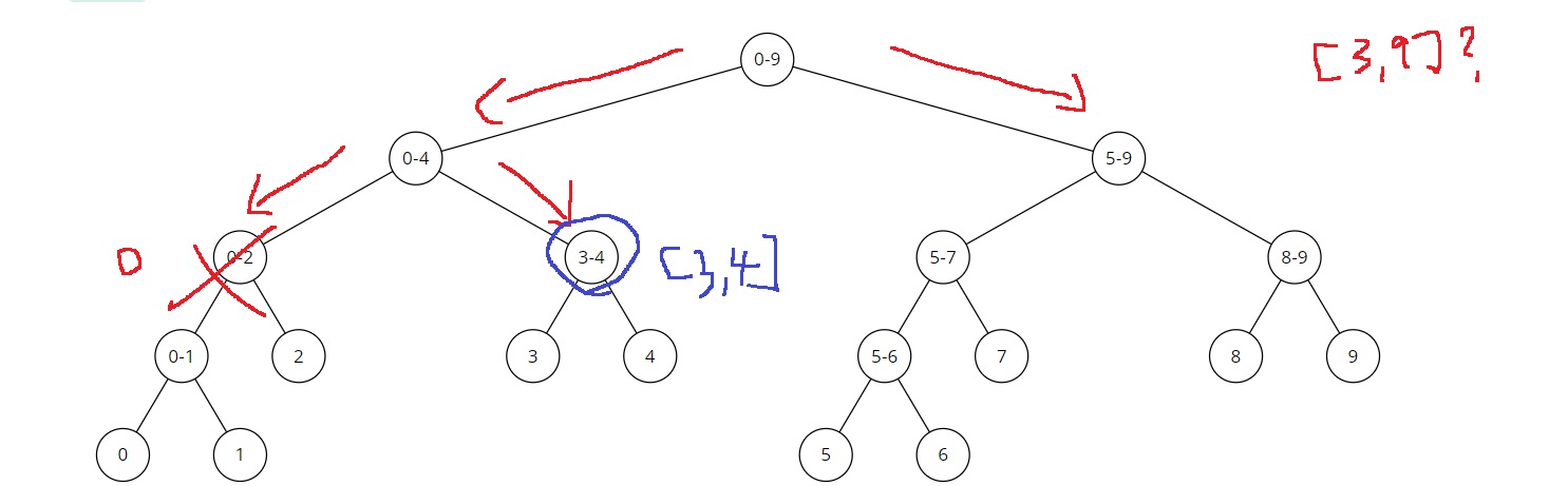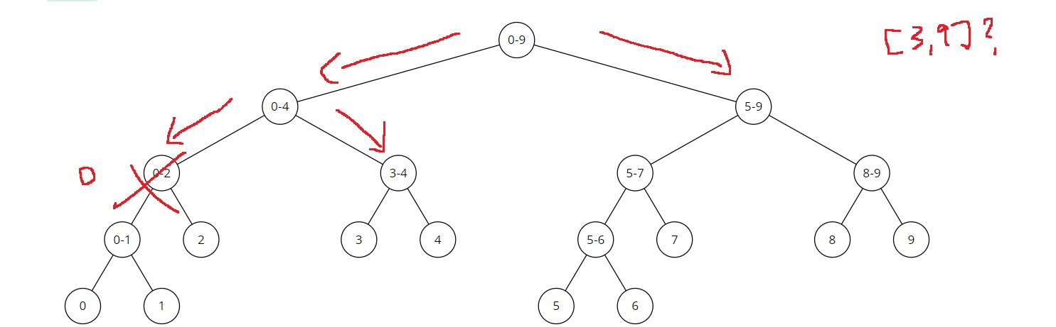 루트 노드는 [0,9]인데, [3,9]가 포함되므로 왼쪽 자식과 오른쪽 자식으로 나누어 탐색하게 된다