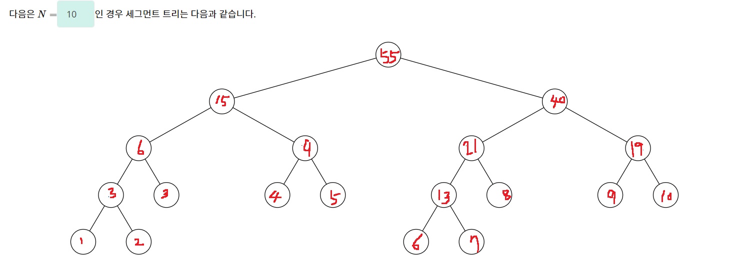 세그먼트 트리를 만들었으면 이제 임의의 구간의 합을 물어볼때 구간의 합을 구할 수 있어야 비로소 쓸모가 있겠지