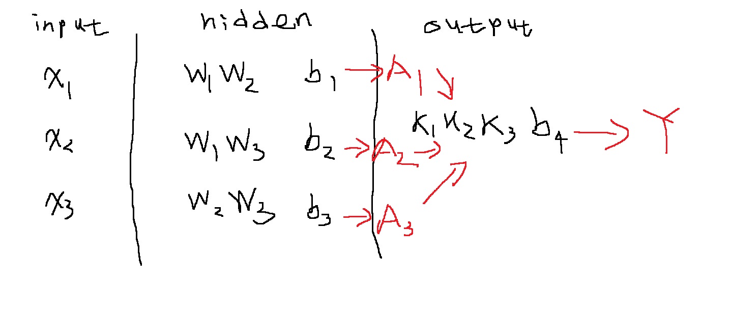$Y = x_{1}w_{1}k_{1} + x_{2}w_{2}k_{1} + b_{1}k_{1} + x_{1}w_{1}k_{2} + x_{3}w_{3}k_{2} + b_{2}k_{2} + x_{2}w_{2}k_{3} + x_{3}w_{3}k_{3} + b_{3}k_{3} + b_{4}$
