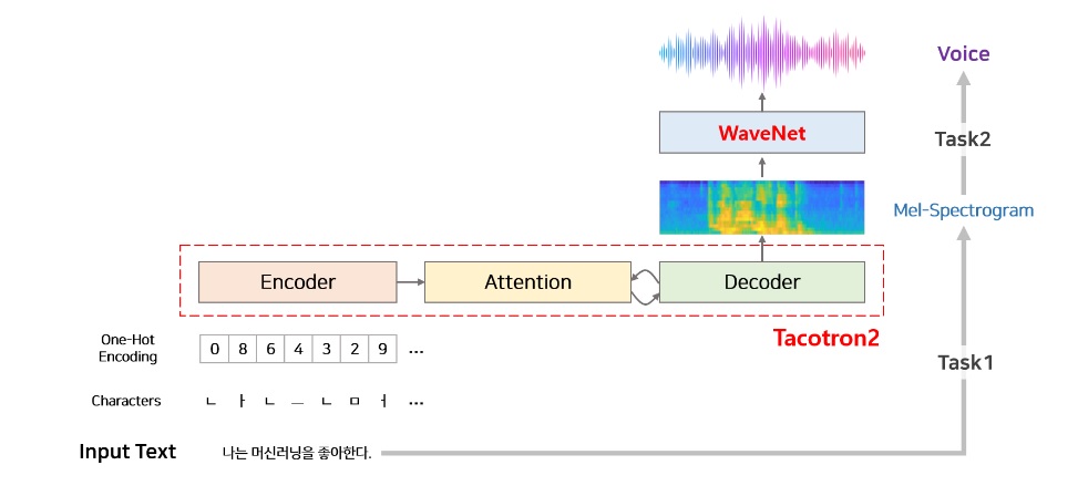 기존에는 이 과정 하나만 해도 상당히 복잡한 절차를 거쳐야 했으나, 타코트론2 같은 딥러닝 모델은 End to End 방식으로 이 과정을 단순화했습니다.