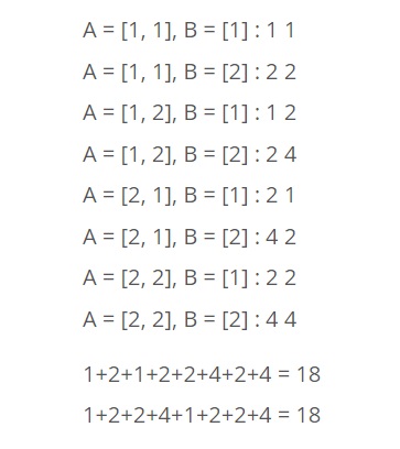A = [1, 1], B = [1] : 1 1 A = [1, 1], B = [2] : 2 2 A = [1, 2], B = [1] : 1 2 A = [1, 2], B = [2] : 2 4 A = [2, 1], B = [1] : 2 1 A = [2, 1], B = [2] : 4 2 A = [2, 2], B = [1] : 2 2 A = [2, 2], B = [2] : 4 4 1+2+1+2+2+4+2+4 = 18 1+2+2+4+1+2+2+4 = 18