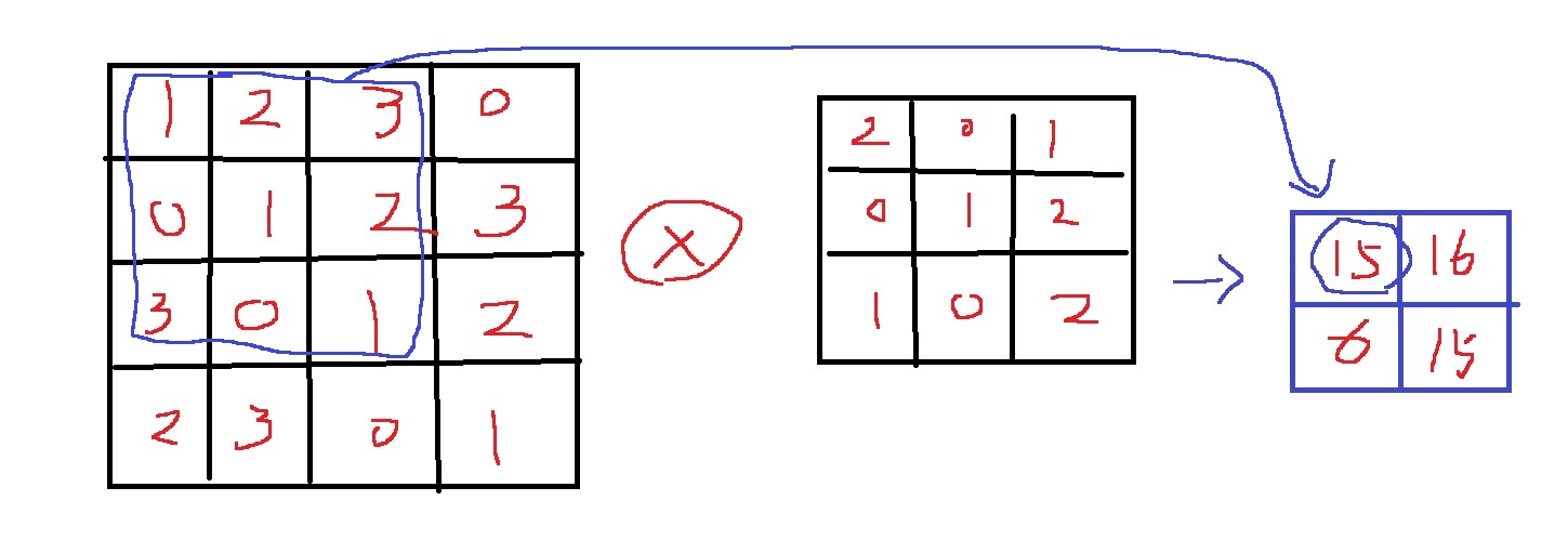 1*2 + 2*0 + 3*1 + 0*0 + 1*1 + 2*2 + 3*1 + 0*0 + 1*2 = 2 + 0 + 3 + 0 + 1 + 4+ 3+ 0 + 2 = 15