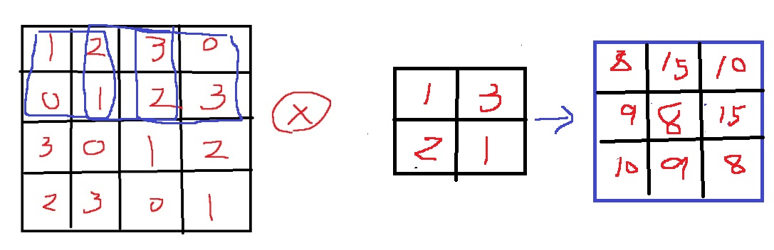 원래는 4*4 input에 2*2 filter를 stride = 1로 적용하면 아래와 같이 3*3 feature map이 나온다.