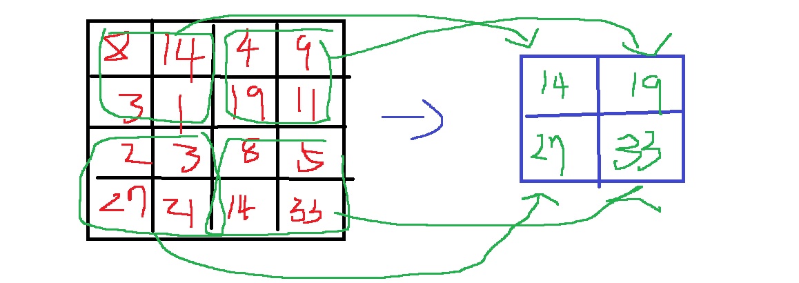 좌상단부터 2*2 크기의 8,14,3,1중 최댓값인 14를 가져오고, 4,9,19,11중 최댓값인 19를 가져오고,
