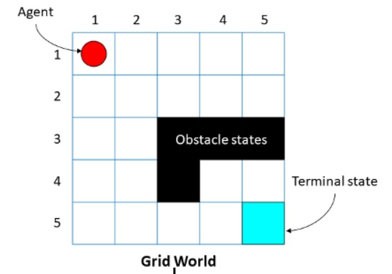| 상태(state) | 에이전트가 처할 수 있는 상황 및 정보 | S={(1,1),(1,2),...,(5,5)} |