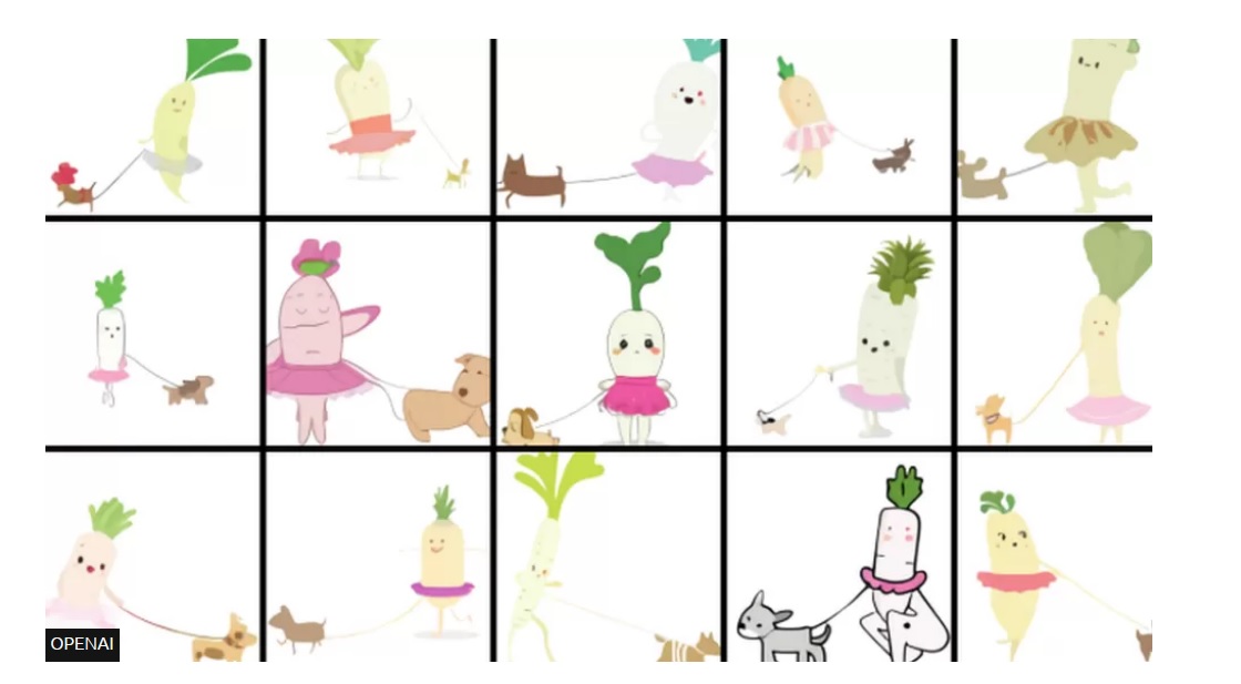 위 그림은 "An illustration of a baby daikon radish in a tutu walking a dog"을 입력받고 그린 그림이다.