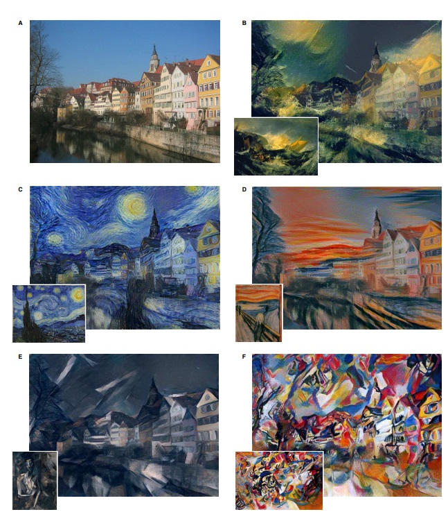 예를 들어 위 그림과 같이 A의 주택가 풍경이라는 content image에 여러 화가의 화풍인 style image를 적용했더니 B~F같은 그림이 나온다.