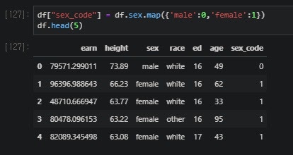 df.sex에서 male은 0으로 바꾸고 female은 1로 바꾼 다음에 sex_code라는 새로운 열을 만들어