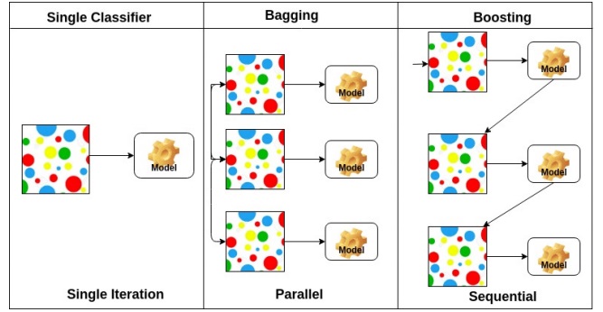 bootstrapping으로 만든 데이터 set으로 여러 모델을 만들고 각 모델의 성능을 적절하게 aggregation 한다