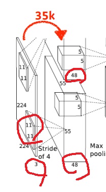 총 parameter는 kernel 크기 11*11*3에 output channel 48*2를 곱한 11*11*3*(48*2)개
