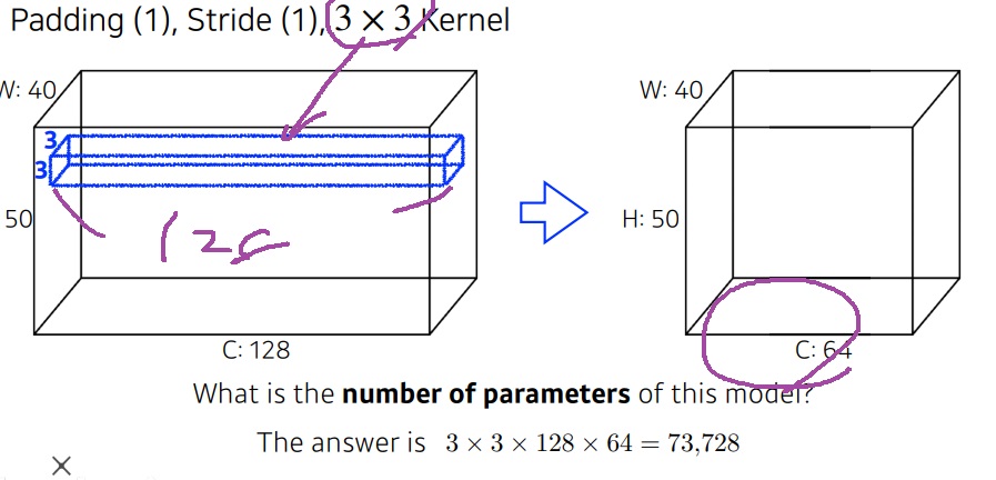 결국에는 output의 spatial dimension인 면 가로,세로는 의미없고 output channel과 kernel 크기가 결정한다