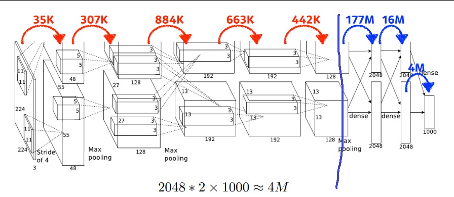 그래서 뒷단의 fully connected layer를 최소화시키고 앞의 convolution layer를 최대한 깊게 하는 것이 요즘 대세
