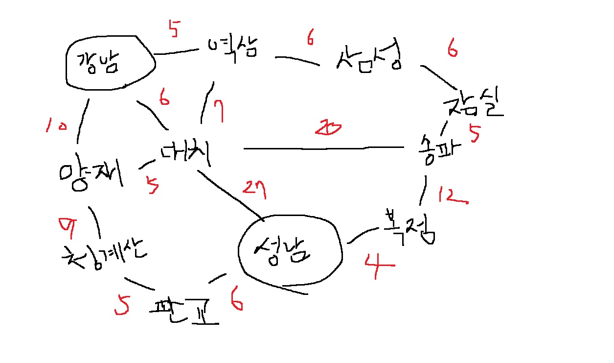 성남에서 강남으로 가는 가장 빠른 경로를 찾는다고 해봅시다.