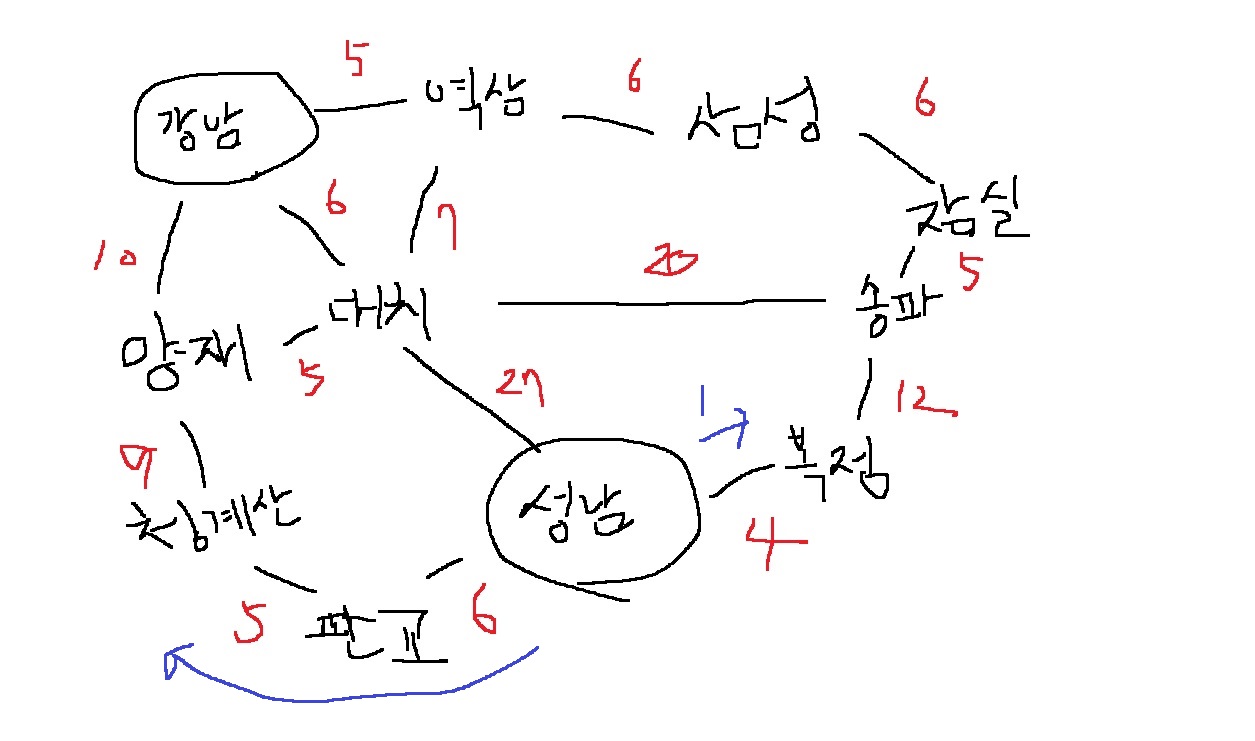 이런 식으로 출발지인 성남을 중심으로, 가장 짧은 시간이 소요되는 위치를 계속해서 돌아보며 최종 도착지인 강남으로 향합니다.
