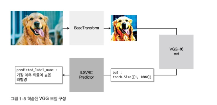 모델에서 1000차원의 출력 torch.Size([1,1000])이 나오고, ILSVRCPredictor에 의해 가장 예측 확률이 높은 라벨명으로 변환되어 최종 예측 결과 출력