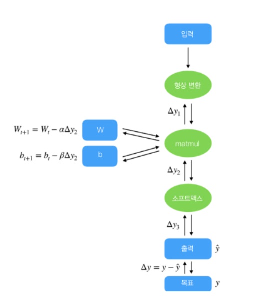 예를 들어 matmul 연산은 전파된 오차 $\Delta y_{2}$만 있으면, W와 b의 갱신된 값을 계산할 수 있다.