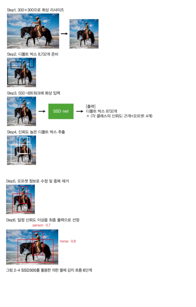 SSD는 입력 이미지의 크기를 300*300 픽셀로 바꾸어 입력하는 SSD300과 512*512픽셀로 처리하는 SSD512 두 패턴이 있다.