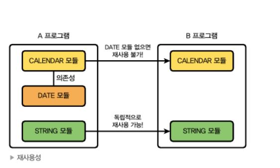 A의 CALENDAR 모듈은 DATE 모듈에 의존되어 있어서 다른 프로그램에 가면 DATE 없이는 재사용 불가능