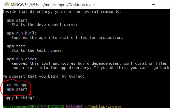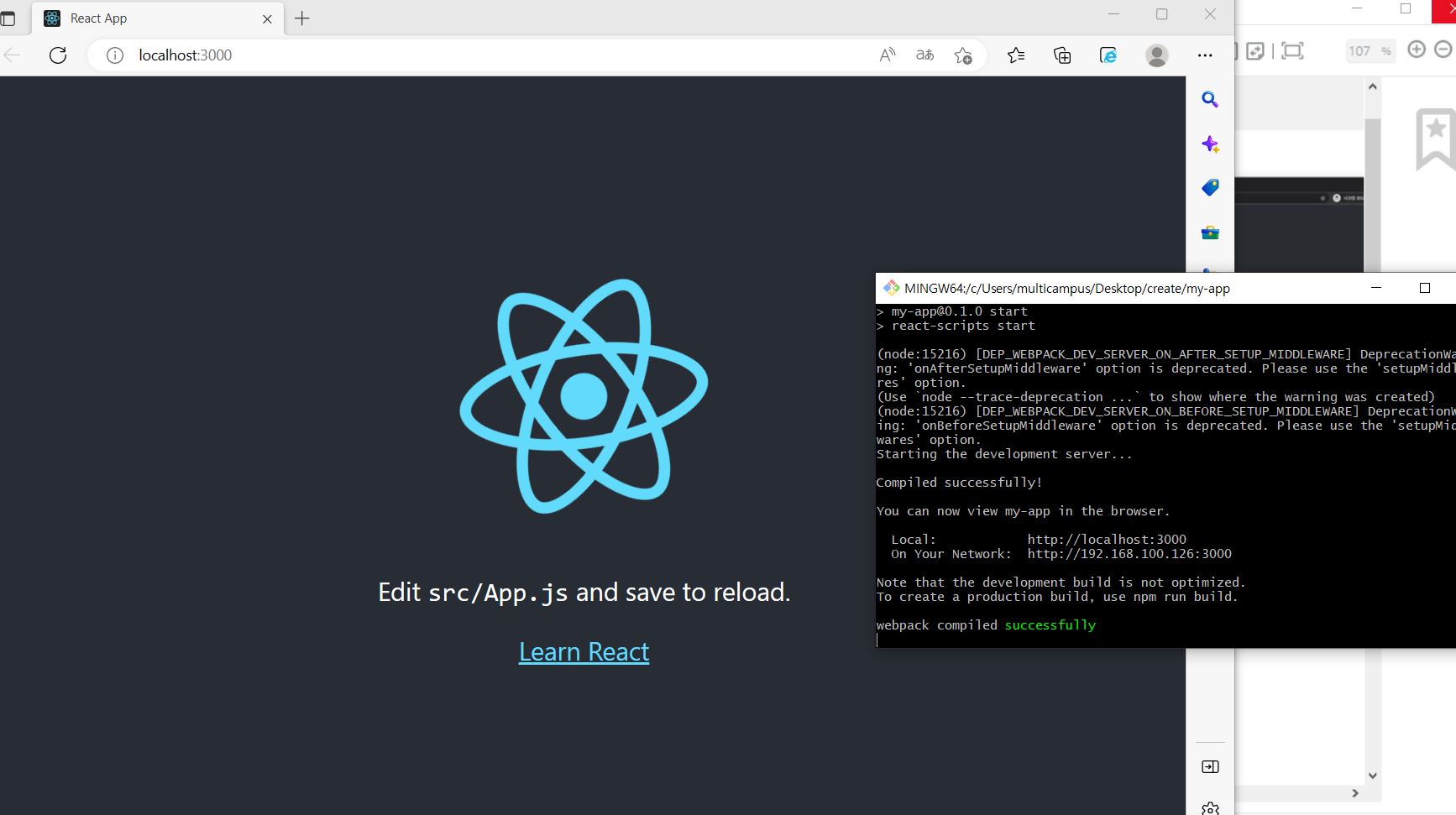 생성한 my-app 프로젝트 폴더로 들어가고, npm start라는 명령어로 애플리케이션을 실행한다