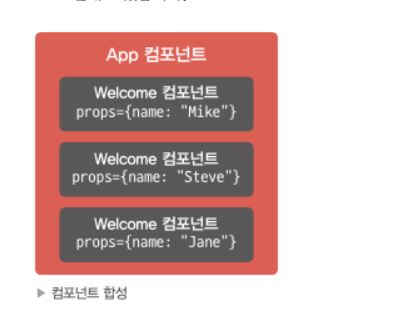 리액트에서는 모든 페이지가 컴포넌트로 구성되어 있고, 하나의 컴포넌트는 또 다른 여러 개의 컴포넌트의 조합으로 구성될 수 있다.