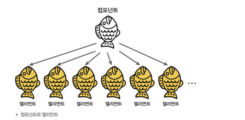 여기에서 리액트 컴포넌트는 붕어빵 틀을 의미하고 각 붕어빵들은 리액트 엘리먼트를 의미한다고 볼 수 있다.