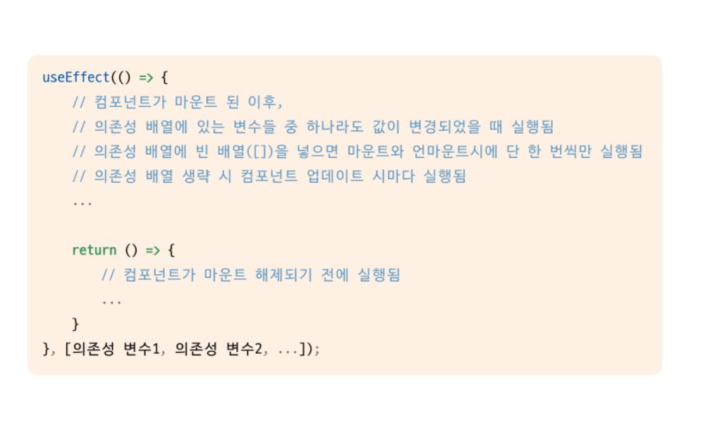 의존성 배열은 생략할 수도 있으나, 생략하게 되면 컴포넌트가 업데이트될 때마다 호출된다.