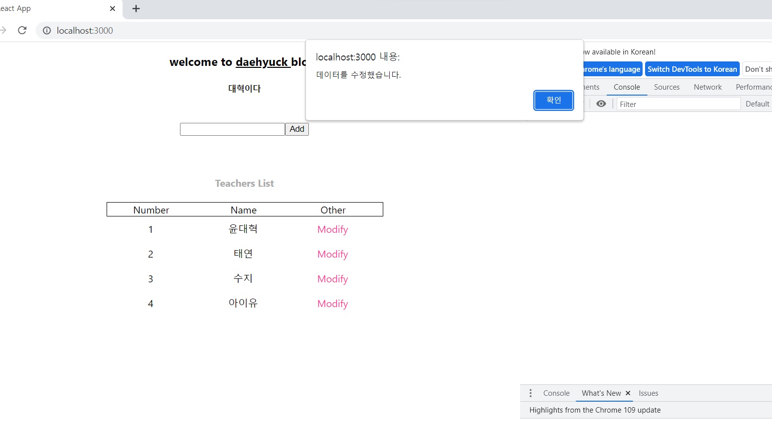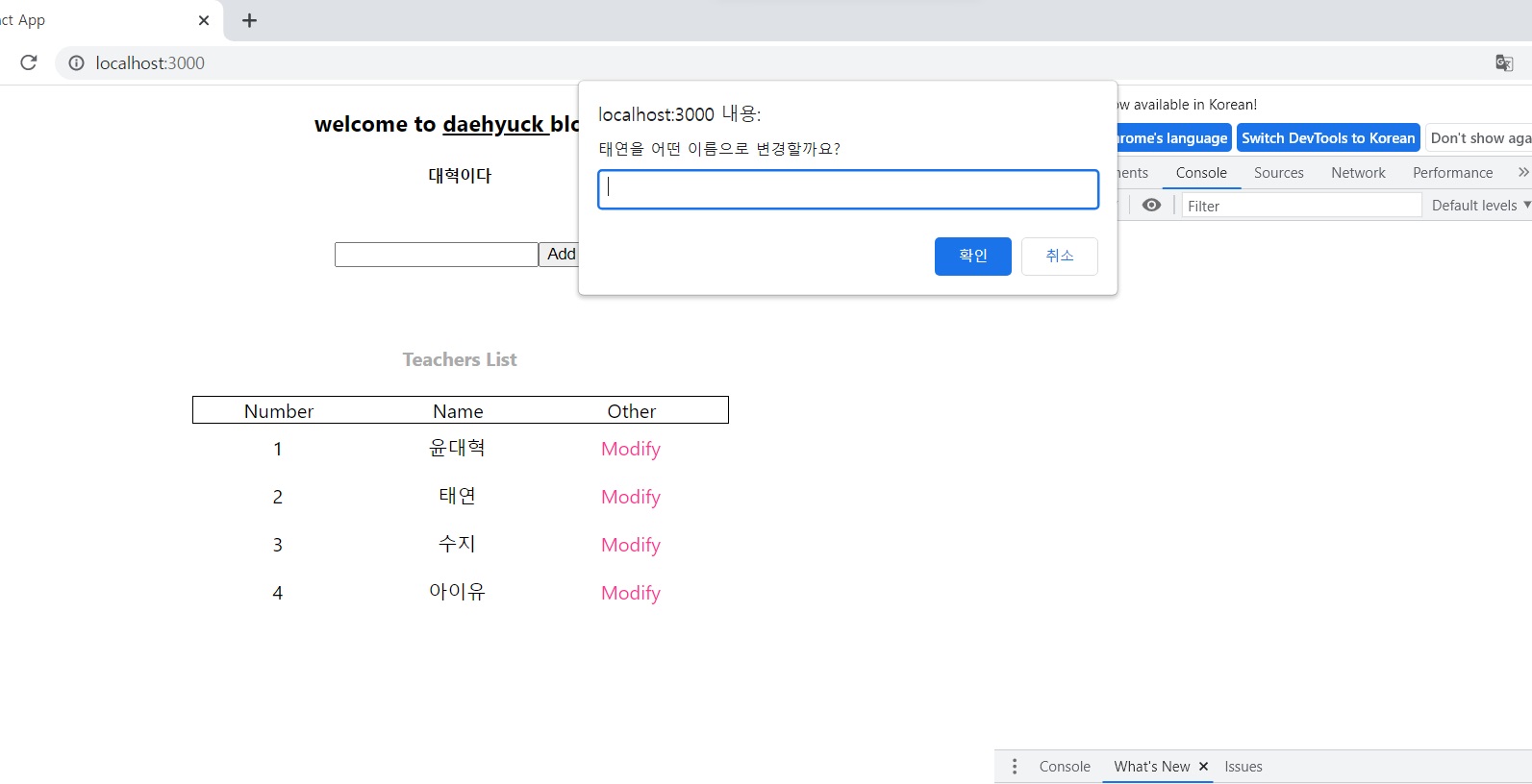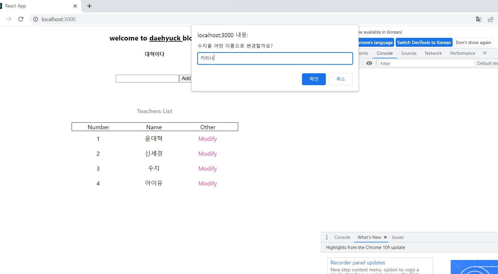 웹에서 Modify를 눌러보면... const modify = prompt(el.name+~)에 의해... 다음과 같이 창이 뜸
