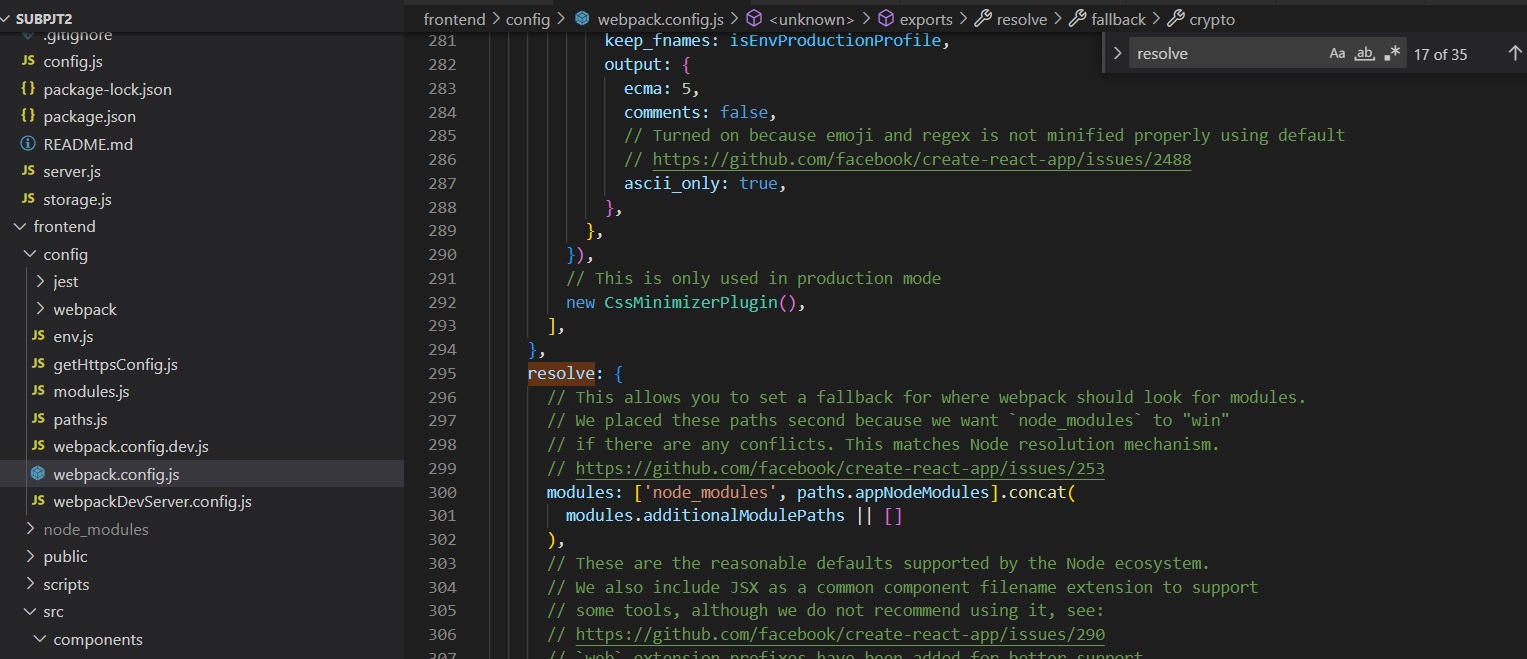 frontend/config/webpack.config.js에서 resolve를 찾아본다