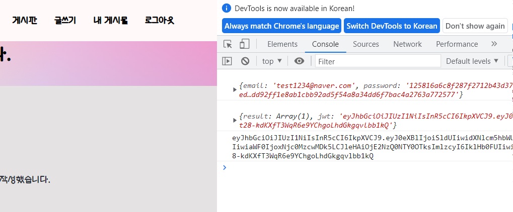아무튼 이렇게 토큰 발급받는 api작성하고 실제 로그인하면 jwt 토큰 발급받는 것을 확인할 수 있다