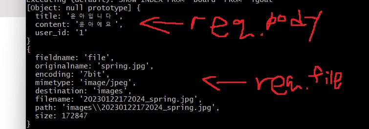 이러면 req에서 req.body에는 text 데이터인 title, content가 저장되어 있고