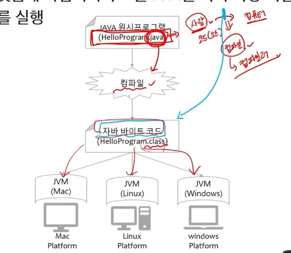 내가 맥이든 리눅스든 윈도우든 어디서 자바 코드를 짜든 동일하게 짜지만, 이것을 실행시키기 위해서는 JVM을 사용해야하는데..