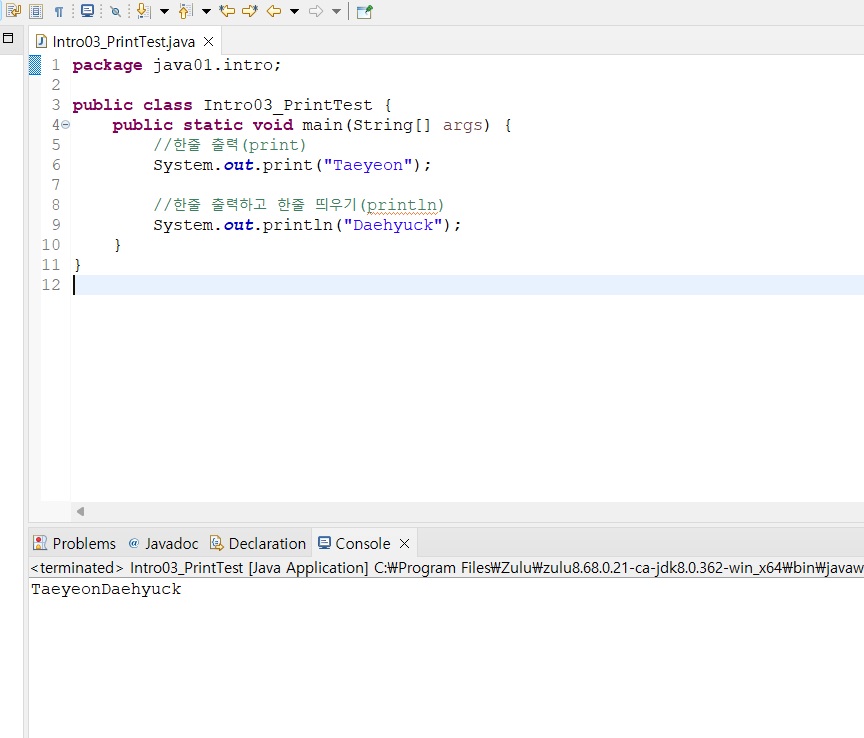 print()는 한줄 출력하고 끝이니까 TaeyeonDaehyuck가 나올것 같다