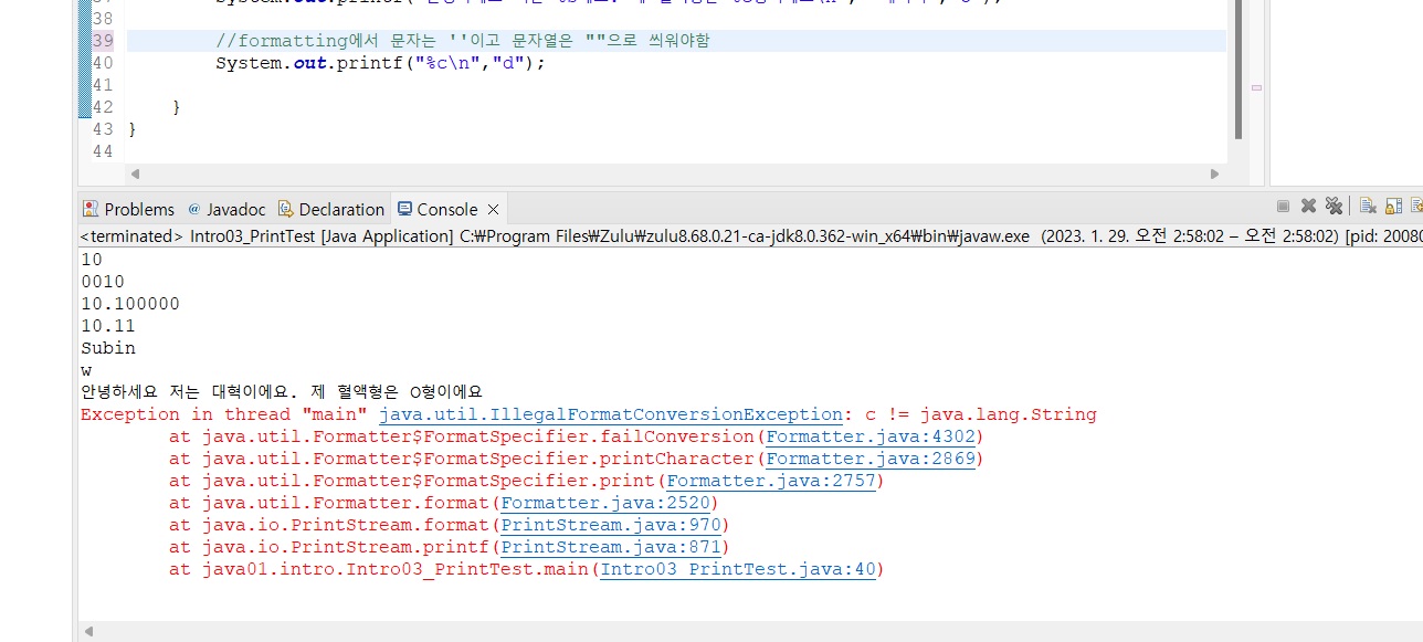 System.out.printf("안녕하세요 저는 %s에요. 제 혈액형은 %c형이에요", "대혁이",'O');