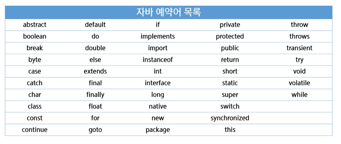 예약어(keyword = 자바 문법을 위해 미리 지정된 단어)는 사용불가