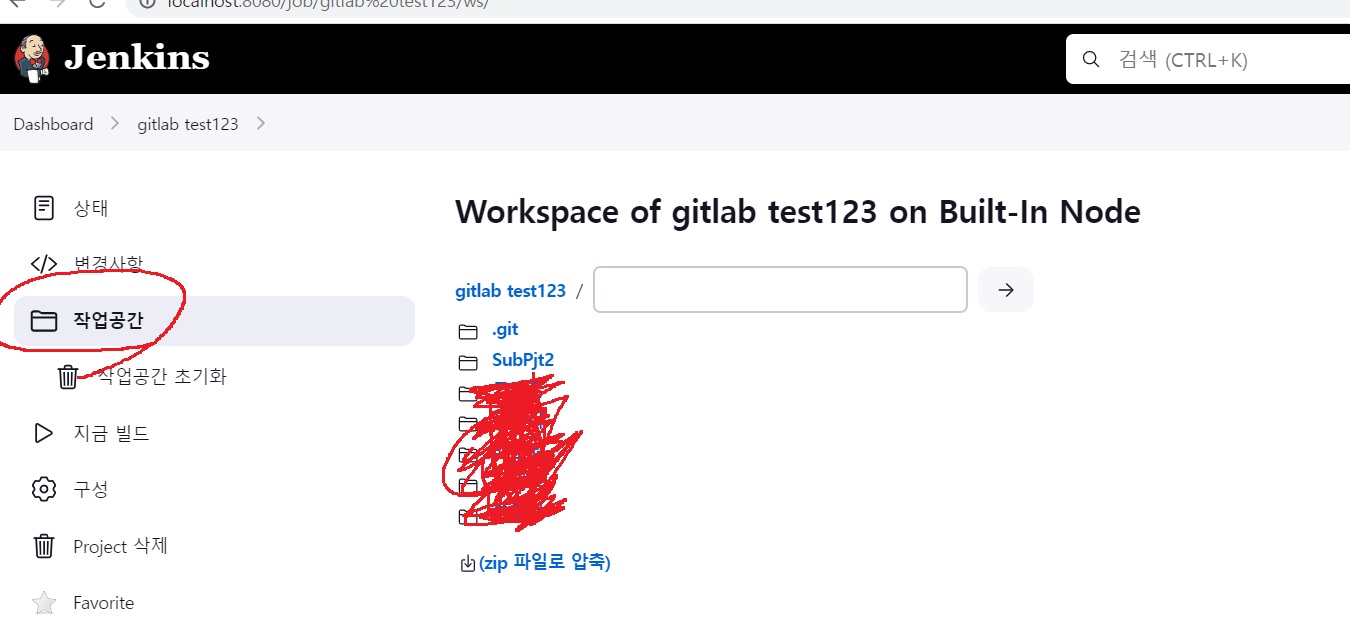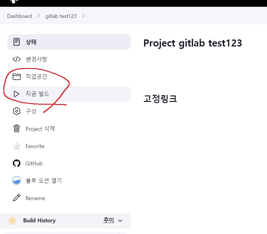 성공적으로 연동 되었다면 좌측 상단에 gitlab test123 누르고 작업공간 눌러보면