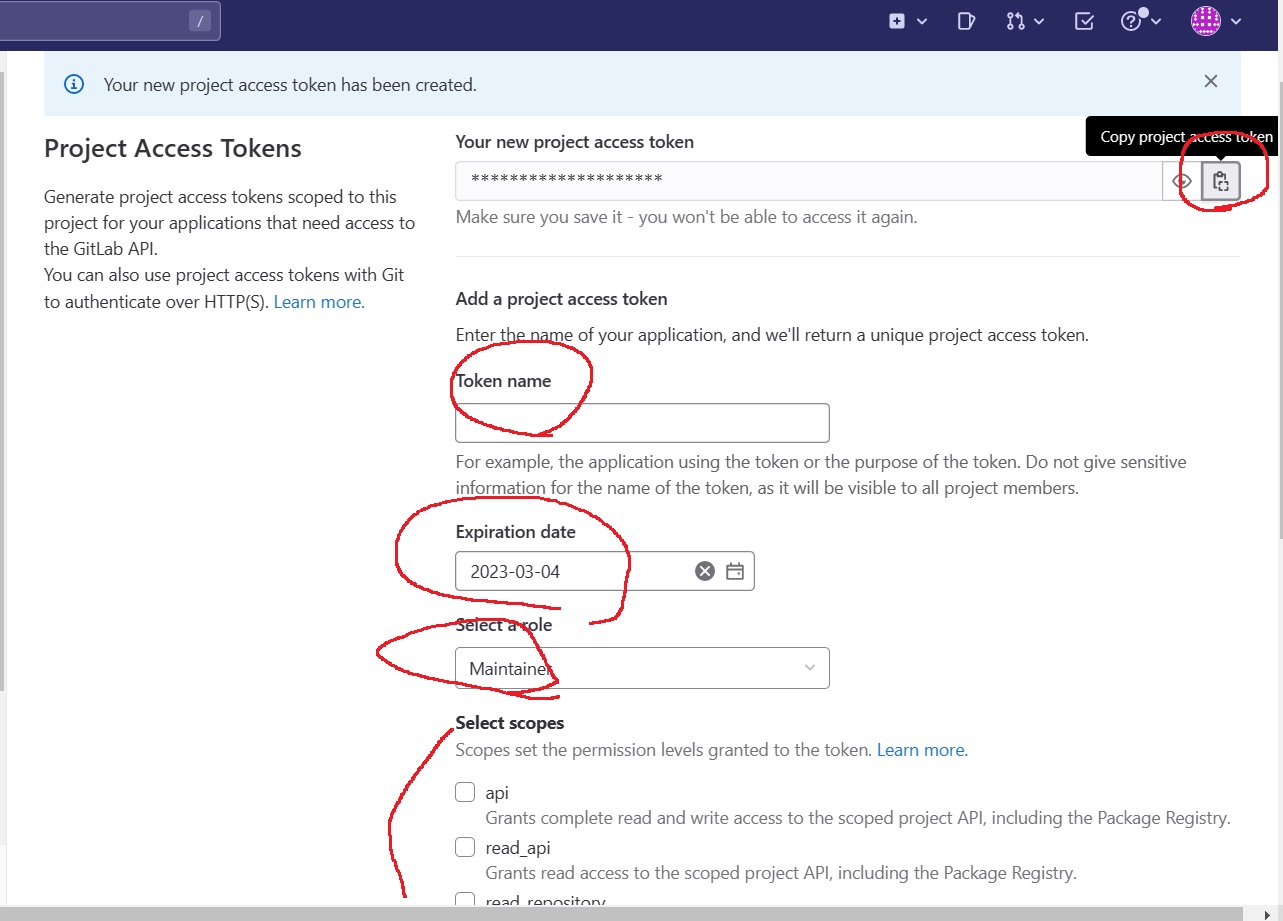 token이름, 권한 설정, 유효기한 등등 설정하고 create하면 상단에 access token이 생성되는데