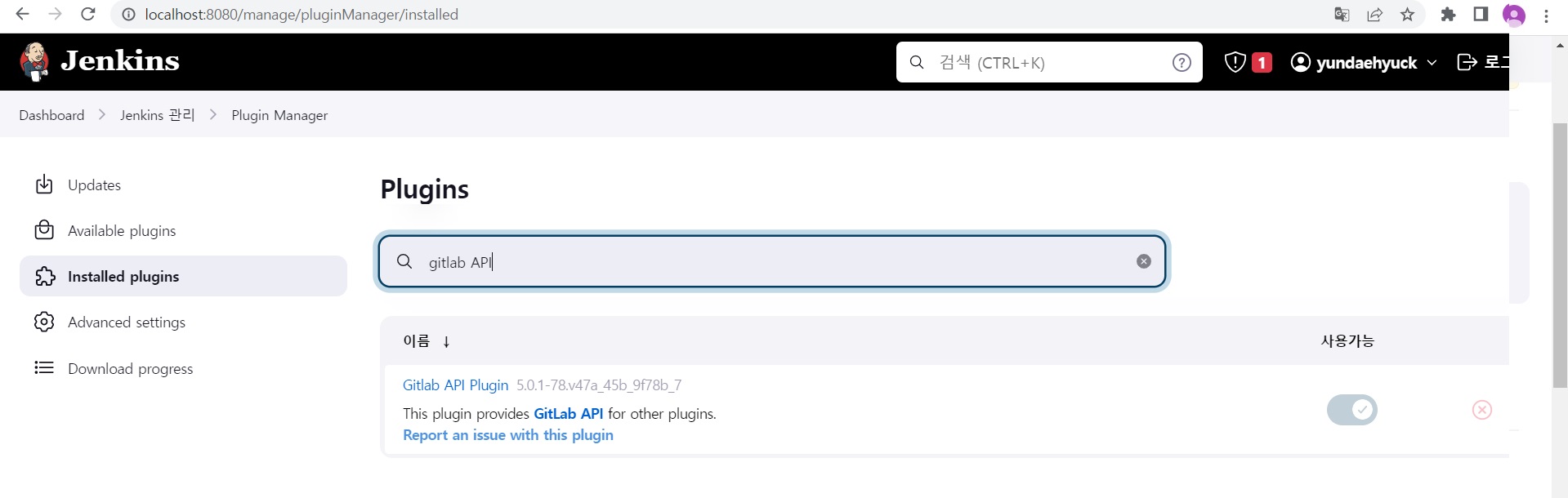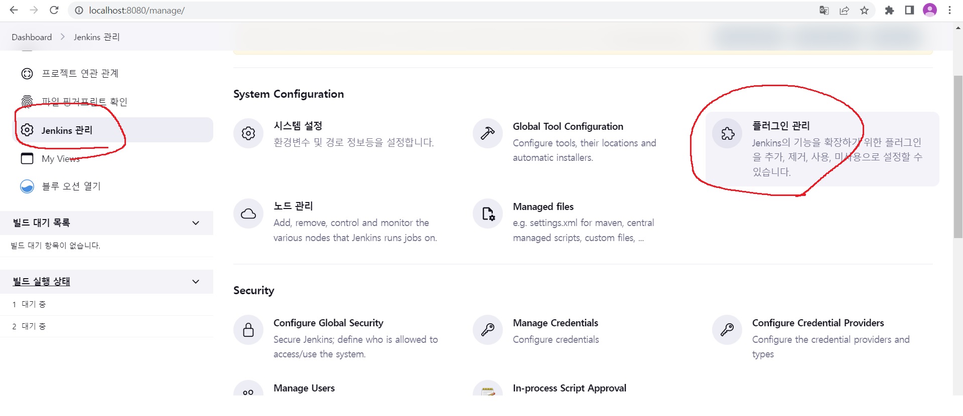 좌측 메뉴에 jenkins 관리 > 우측 메뉴들에 플러그인 관리로 들어간다