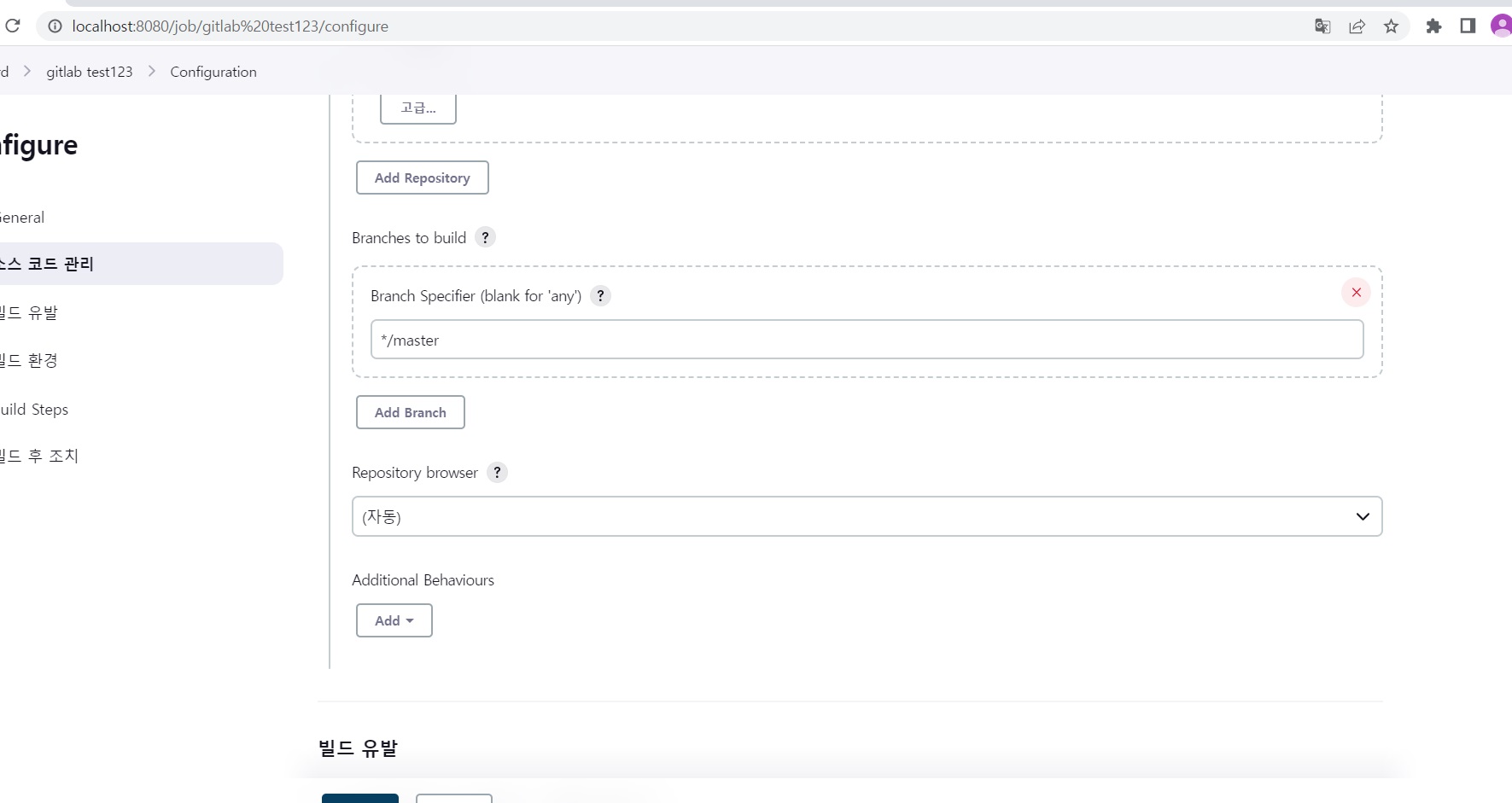 생성한 credentials 선택하고 바로 아래에 branches to build 부분이 있음