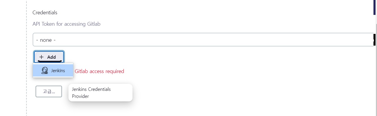 credentials 쪽에 원래 none인데.. +add 버튼 누르고 jenkins 들어가면 생성가능