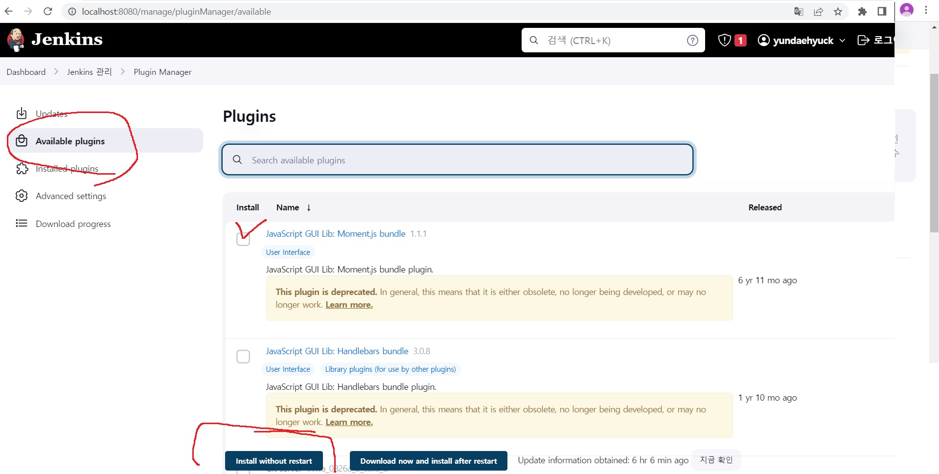 좌측에 available plugins를 누르고 아래 플러그인들을 하나하나 검색해서