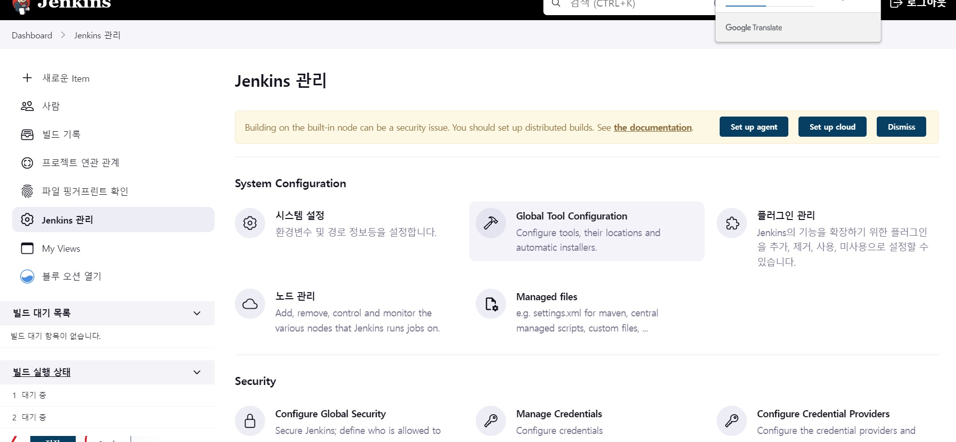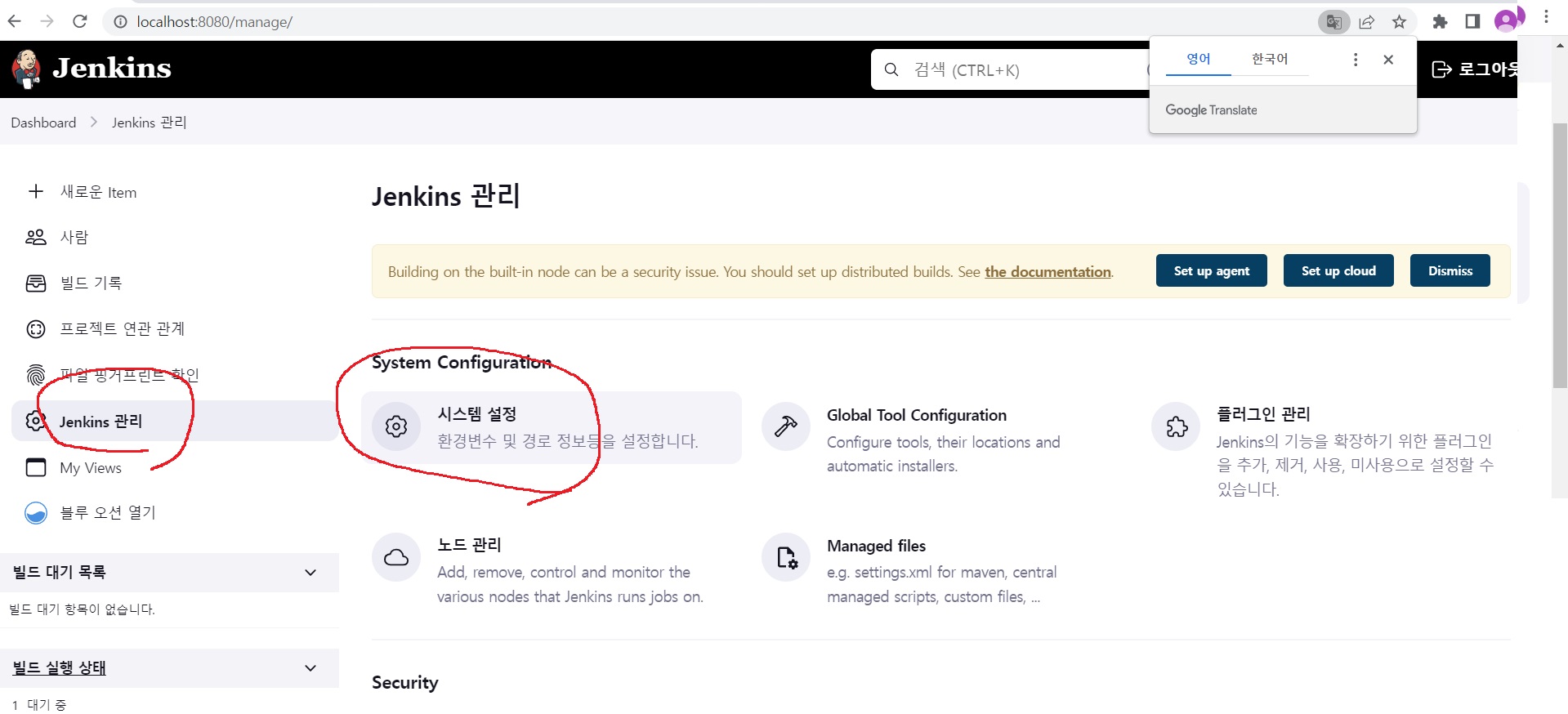 좌측 jenkins 관리 >> 시스템 설정으로 들어간다