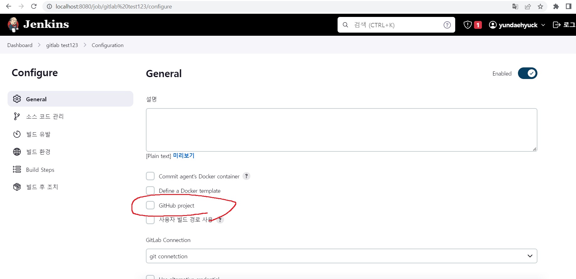 그러면 configure 화면이 나오는데 github project 버튼 누르고 본인의 gitlab url을 입력