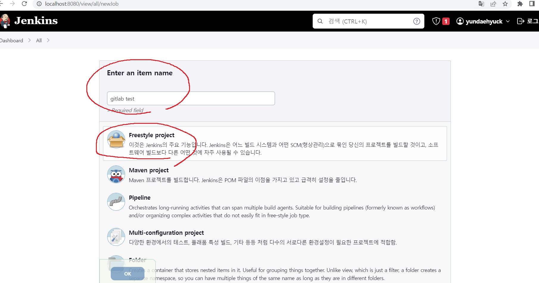 freestyle project 누르고 아래에 ok 눌러준다.