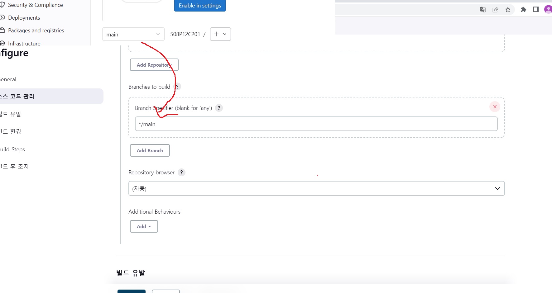 기본이 master로 되어 있는데 본인 프로젝트에서 빌드하고 싶은 branch가 main이라면 main으로 변경해줌