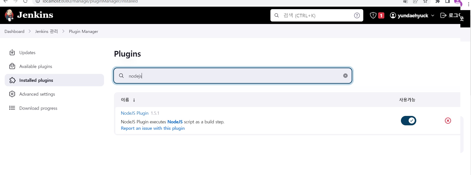 installed plugins에서 nodejs 검색해서 nodejs plugin이 설치되어있는지 확인