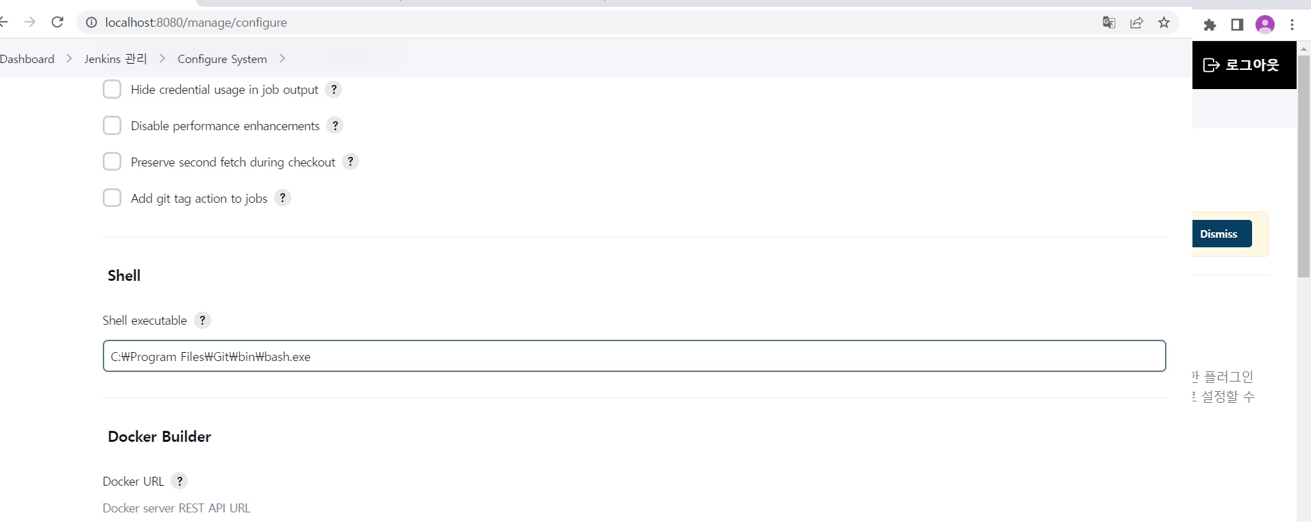 Caused: java.io.IOException: Cannot run program "sh" Windows Jenkins에서 Job을 생성한 후 Build에서 'Execute shell'을 사용하려면 설정이 필요하다. Jenkins 메인화면 좌측에 있는 Jenkins 관리 -> 시스템설정 -> Shell 항목