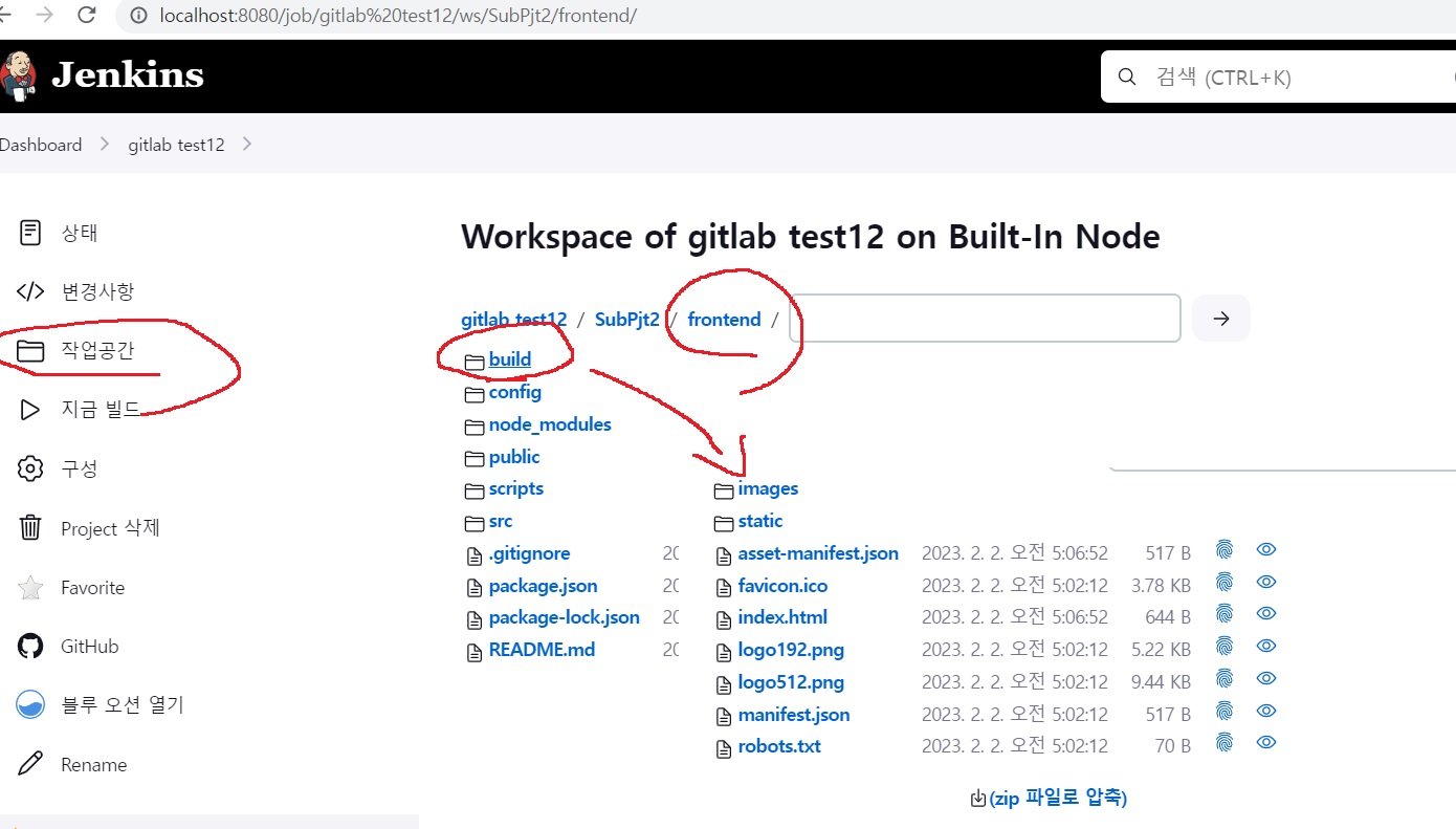 작업공간으로 가서 react 프로젝트가 있는 폴더로 가서 build 폴더가 잘 생성된지 확인한다