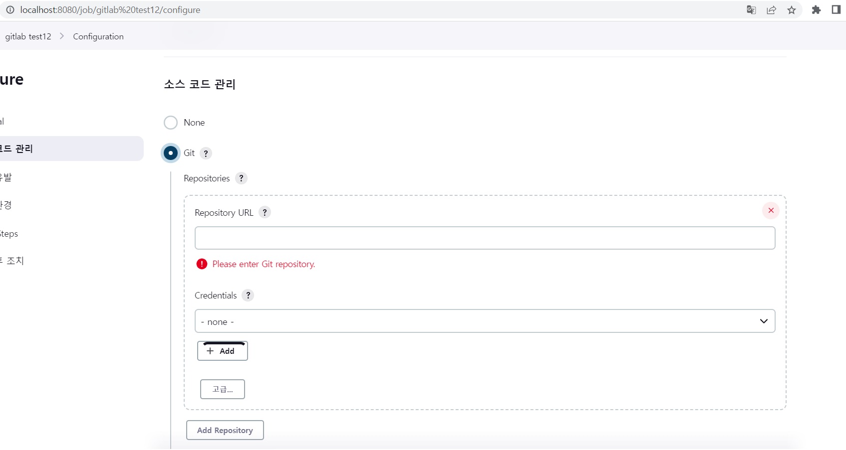 아래 소스코드 관리에서 git을 선택하고